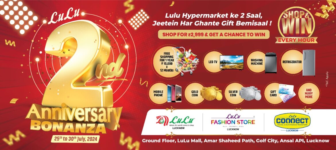 लखनऊ,समाचार10 India। लुलु हाइपरमार्केट लखनऊ की दूसरी वर्षगांठ पर शानदार गिफ्टस ।एक भाग्यशाली ग्राहक अगले 12 महीनों के लिए 10000 मूल्य की मुफ़्त शॉपिंग जीतेगा।इस 6 दिवसीय वर्षगांठ सेल के दौरान ग्राहकों द्वारा जीते जाने वाले और भी पुरस्कार। ग्राहकों के पास प्रति घंटे शानदार पुरस्कार जीतने का अविश्वसनीय अवसर है, जिसमें एलईडी टीवी, रेफ्रीजिरेटर, वॉशिंग मशीन, मोबाइल फोन, सोने और चांदी के सिक्के, 5000 और 1000 रुपये के शॉपिंग वाउचर और कई अन्य उपहार शामिल हैं।