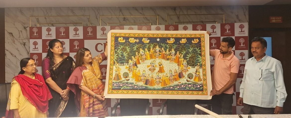 प्रेस कॉन्फ्रेंस में उपस्थित अनारबेन पटेल (संस्थापक, ग्रामश्री और क्राफ्टरूट्स), लीना रावल (ट्रस्टी, ग्रामश्री), हसीमभाई (तसर सिल्क, झारखंड), दिनेशभाई सोनी (पिछवाई पेंटिंग, राजस्थान), अर्पिता दास (जामदानी बुनाई, पश्चिम बंगाल) उपस्थित थे |