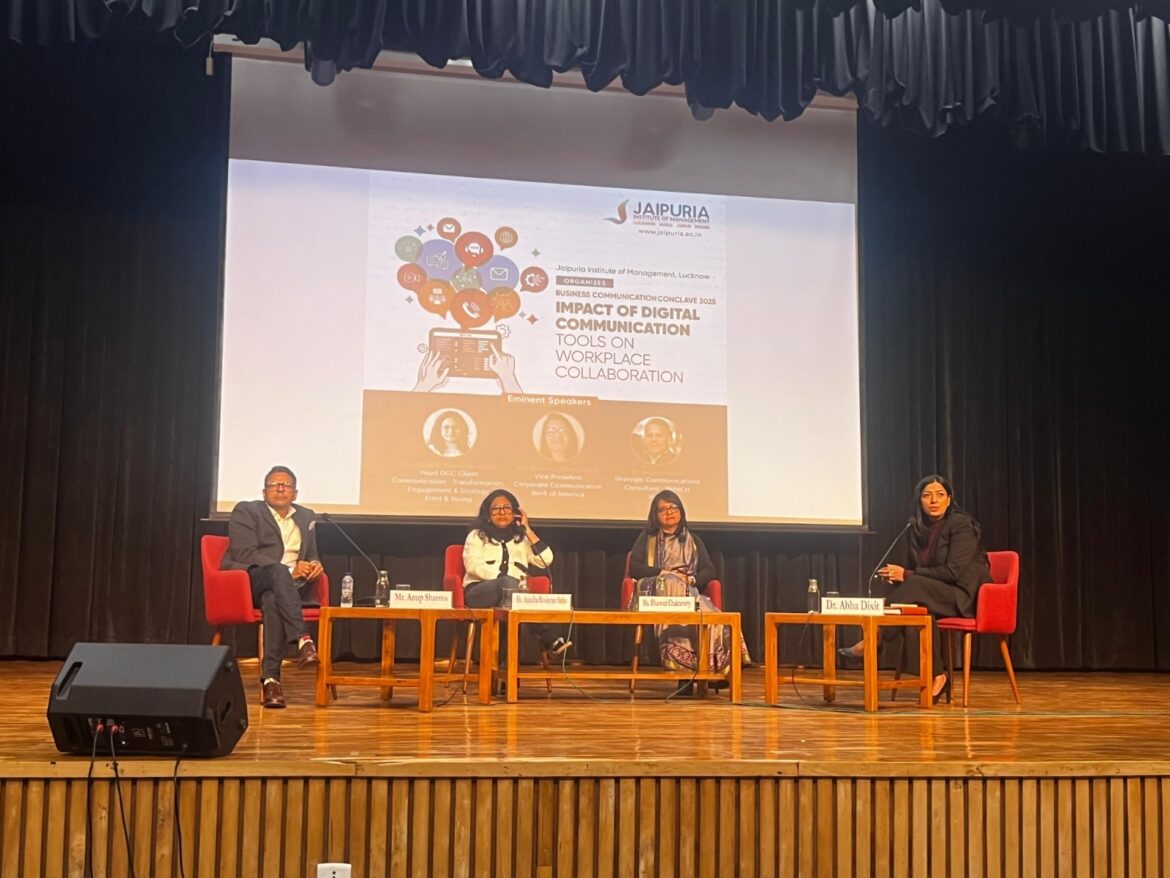 लखनऊ,यूपी। जयपुरिया इंस्टीट्यूट ऑफ मैनेजमेंट, लखनऊ ने “कार्यस्थल सहयोग पर डिजिटल संचार उपकरणों के प्रभाव” (इम्पैक्ट ऑफ़ डिजिटल कम्युनिकेशन टूल्स ऑन वर्क प्लेस कोलैबोरेशन) विषय पर केंद्रित बहुप्रतीक्षित बिजनेस कम्युनिकेशन कॉन्क्लेव की सफलतापूर्वक मेजबानी की। इस कॉन्क्लेव के प्रतिष्ठित वक्ताओं के पैनल में अनिंदिता मुखर्जी सिन्हा, प्रमुख जीसीसी क्लाइंट कम्युनिकेशन, अर्न्स्ट एंड यंग; भास्वती चक्रवर्ती, उपाध्यक्ष, कॉर्पोरेट कम्युनिकेशन, बैंक ऑफ अमेरिका; और अनूप शर्मा, रणनीतिक संचार सलाहकार, पीएमएनसीएच, डब्ल्यूएचओ शामिल थे। इस कार्यक्रम में वक्ताओं के एक प्रतिष्ठित पैनल ने इस बारे में अपने विचार साझा किए कि कैसे डिजिटल संचार उपकरण व्यावसायिक बातचीत को नया रूप दे रहे हैं और आधुनिक कार्यस्थलों में सहयोग को बढ़ावा दे रहे हैं।