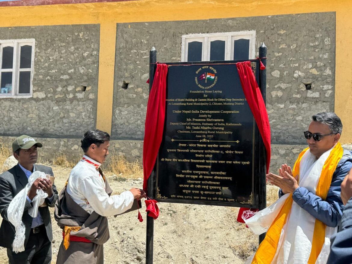 काठमांडू,समाचार10 India-रिपोर्ट.शाश्वत तिवारी। नेपाल में मस्तंग जिले के लोमंथांग ग्रामीण नगर पालिका में बीते रविवार को दिव्य दीप माध्यमिक विद्यालय में नए छात्रावास भवन और कैंटीन ब्लॉक की आधारशिला रखी गई, जिसका निर्माण भारत की वित्तीय सहायता से किया जा रहा है। भारतीय दूतावास द्वारा जारी एक बयान के अनुसार, काठमांडू स्थित भारतीय दूतावास में मिशन के उप प्रमुख प्रसन्ना श्रीवास्तव और लोमंथांग ग्रामीण नगर पालिका के अध्यक्ष तासी न्हार्बू गुरुंग ने संयुक्त रूप से आधारशिला रखी।