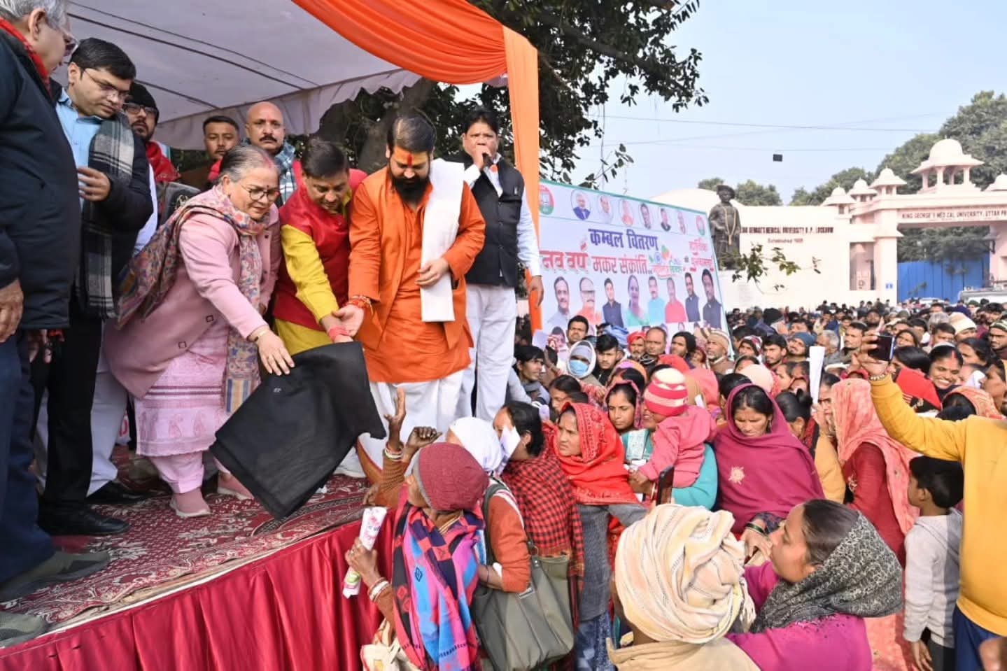 लखनऊ,समाचार10India। किंग जॉर्ज मेडिकल यूनिवर्सिटी (केजीएमयू) के गेट नंबर–2 पर अजय कनौजिया एवं उनकी टीम की ओर से कंबल वितरण एवं तहरी भोज का आयोजन किया गया। इस अवसर पर मुख्य अतिथि के रूप में लखनऊ की महापौर सुषमा खर्कवाल एवं विशिष्ट अतिथि के रूप में श्री कोतवालेश्वर महादेव मंदिर के महंत विशाल गौड़ उपस्थित थे।