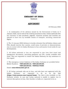 दूतावास ने इस एडवाइजरी की कॉपी सोशल मीडिया मंच ‘एक्स’ पर भी साझा की है, जिसमें कहा गया है पांच जनवरी को भारत सरकार की ओर से जारी एडवाइजरी की निरंतरता में और ईरान में बदलती स्थिति को देखते हुए, ईरान में मौजूद भारतीय नागरिकों (जिनमें छात्र, व्यापारी, पर्यटक और तीर्थयात्री शामिल हैं) को उपलब्ध परिवहन साधनों का इस्तेमाल करते हुए तत्काल ईरान छोड़ने की सलाह दी जाती है। सभी भारतीयों से प्रार्थना है कि वे अपने ट्रैवल और इमिग्रेशन डॉक्यूमेंट्स, जिसमें पासपोर्ट और आईडी शामिल हैं, अपने पास ध्यान से रखें। उनसे रिक्वेस्ट है कि इस बारे में किसी भी मदद के लिए इंडियन एम्बेसी से कॉन्टैक्ट करें।